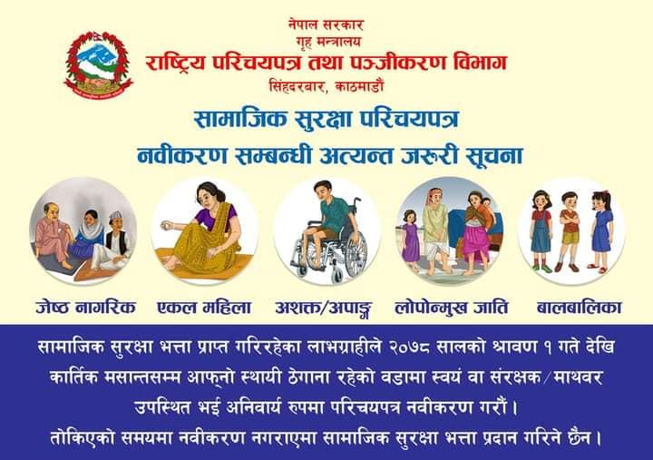 सो को लागि श्रावण १ गते देखि कात्तिक मसान्त सम्मको समय सिमा तोकिएको भए ता पनि समयमा नविकरण गराउन नसकेका लाभग्राहिहरुलाई आफ्नो प्रणालिबाट नाम हटाउने तथा पुनः नयाँ लाभग्राहिको रुपमा आफ्नो नाम दर्ता गराउनुपर्ने तथा सो अवधिको सामाजिक सुरक्षा भत्ता नदिइने व्यहोरा पनि सूचना निकाली जानकारी गराएको छ ।