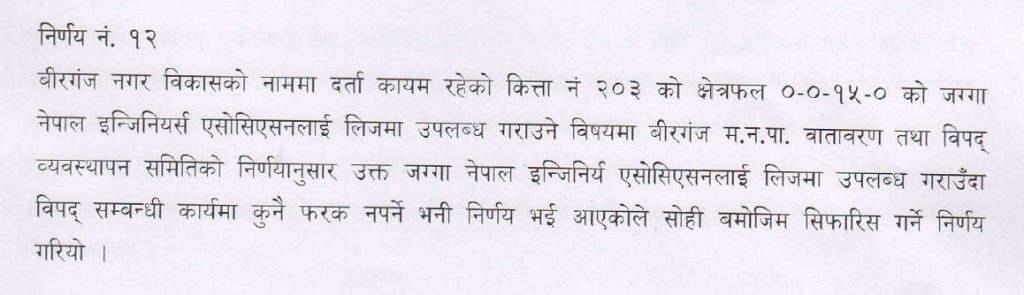 जसको निर्णय नं. १२ मा “बीरगंज नगर विकासको नाममा दर्ता कायम रहेको कित्ता नं. २०३ को क्षेत्रफल ०–०–१५–० को जग्गा नेपाल इन्जिनियर्स एशोसिएशनलाई लिजमा उपलब्ध गराउने विषयमा बीरगंज महानगरपालिका वातावरण तथा विपद् व्यवस्थापन समितिको निर्णय अनुसार उक्त जग्गा नेपाल इन्जिनियर्स एशोसिएशनलाई लिजमा उपलब्ध गराउँदा विपद् सम्बन्धि कार्यमा कुनै फरक नपर्ने भनी निर्णय भई आएकोले सोही बमोजिम सिफारिस गर्ने निर्णय गरियो ।” भनिएको छ तर त्यसमा लिजसँग सम्बन्धित धेरै कुरा अस्पष्ट रहेको छ । जस्तै के कस्तो प्रतिस्प्रर्धा वा प्रकृया पुर्याएर दिइएको हो ? कहिले देखि कहिले सम्मका लागि लिजमा दिइएको हो ? के कति पेश्की सहित वार्षिक कति भाडा लिने दिने हो ? कति वर्षमा भाडा बढाइने हो ? लगायत जनताले जान्न चाहेको अन्य धेरै कुरा खुलाइएको छैन ।
